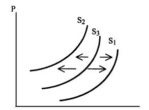 По аналогии со сдвигом кривой спроса можно отметить, что под влиянием факторов, воздействующих на объем предлагаемого на рынке товара, происходит увеличение предлагаемого товара при каждом значении цены Р, в результате чего кривая S сместится вправо (кривая S1 — расширение предложения). Уменьшение Qs при каждом значении Р вызовет сдвиг кривой влево (кривая S2 — снижение предложения).