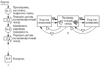 Рис. 11.1. Схема организации синхронизированного производства: I - маршрутная схема производственного процесса; II - схема движения контейнеров с картами "канбан"