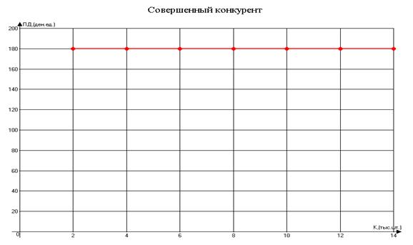 4. Итак, для графика совершенного конкурента Ц=const=90 (денежных единиц); ПД=const=180 (денежных единиц); ПД=DВВ; ПД не зависит от объёма производства (К).