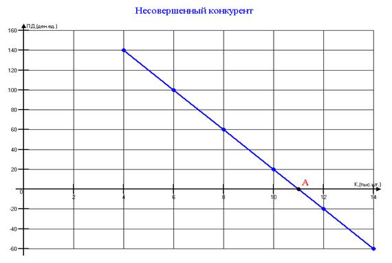 График для несовершенного конкурента показывает, что при увеличении количества продукции постепенно снижается предельный доход; (·)А – критическая точка выпуска объёма продукции после которой ПД уменьшается; 11тыс.шт. – предел выпуска продукции (абсолютное снижение выручки).