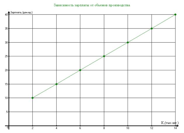 5. Из графика видно, что при увеличении объёма производства средняя зарплата одного работника возрастает на 5 (ден. ед.).