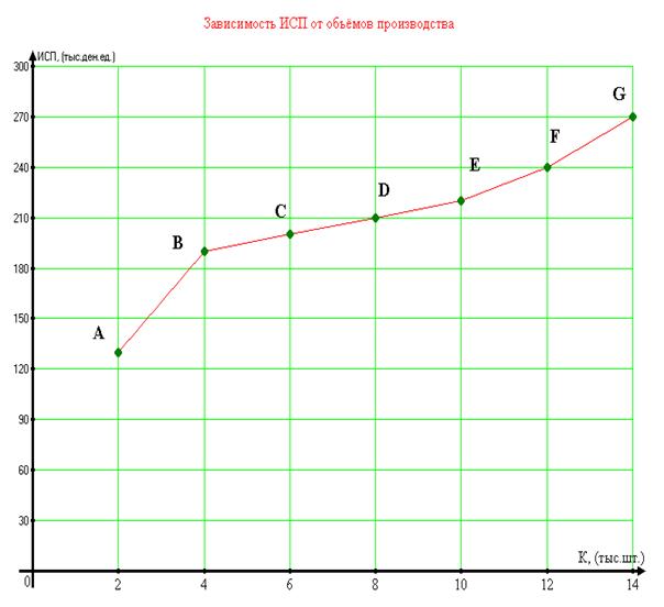 1. Участок графика (A-B) указывает на то, что при начальном объёме производства (2000 шт.) резко возрастают ИСП, в результате того, что в начале производственного процесса требуются существенные затраты на оборудование, привлечение рабочей силы и оплату других факторов производства.