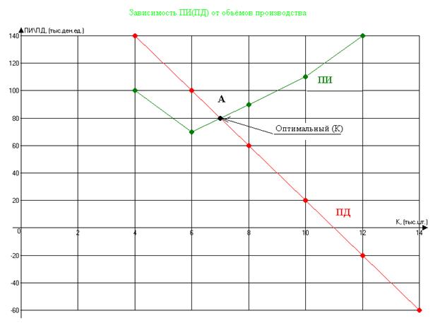А – (·) пересечения графиков (ПИ\ПД от К) соответствует оптимальному объёму производства, т.к. при дальнейшем увеличении ПИ (начиная с К=6000 шт.), ПД начинает снижаться, а вместе с ним уменьшается и прибыль.