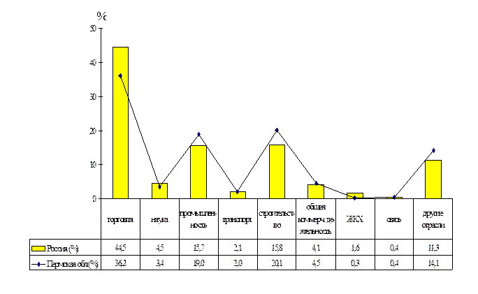 Значительное число субъектов малого предпринимательства традиционно концентрируется в сфере услуг и торговли. Отраслевая структура малого предпринимательства в Пермской области имеет некоторые отличия от среднероссийской (рисунок 1).
