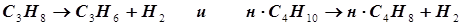 Аналогично реакциям дегидрирования и расщепления по двум направлениям можно представить разложение н-бутана. Алканы С2 -С4 разлагаются согласно молекулярным реакциям [1]: