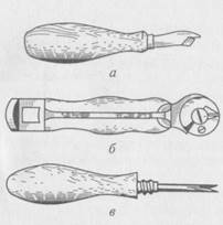 Показаны ножи различных конструкций и назначений. Нож, предназначенный для раскроя кож верха обуви и подкладок, состоит пустотелой металлической ручки 1, в которую вставляют полотно 2 и закрепляют его винтом 3. Рабочую часть ножа ( 2 /3 общей длины) закаливают по твердости HR=50 – 54. После термообработки лезвие ножа должно быть плавным со стрелкой прогиба до 2 мм. Нож б с клиновидным острием предназначен для обработки кожаных деталей низа обуви (спускание задника, язычка подошв и т. п.). Нож с криволинейным острием используется для обработки деталей верха.