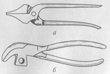 Для захватывания края заготовки верха обуви в процессе обтяжки и затяжки используют затяжные клещи обыкновенные (рис. 2.9, а) и с молотком (рис. 2.9, б). Молотком затяжных клещей забивают гвозди и одновременно он, служит упором. При наличии такого упора облегчается затяжка плотных материалов. Для изготовления затяжных клещей используют конструкционную сталь. Губки клещей и молотков термически обрабатывают; на губках клещей не должно быть острых ребер; рабочие концы губок должны быть слегка закруглены. Вращение клещей должно быть легким, без шатаний и перекашивания. При сжимании ручек губки клещей должны плотно сходиться. Рабочую часть клещей полируют, а остальную поверхность оксидируют. Для удаления из деталей обуви металлических крепителей или их откусывания заподлицо с поверхностью деталей, а также для удаления изношенных деталей низа применяют клещи с острыми губками: кусачки боковые, кусачки-острогубцы, хозяйственные. Клещи с тупыми губками (плоскогубцы) предназначены для удаления металлических крепителей из труднодоступных частей обуви.