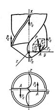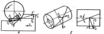 В процесі різання на кожен зуб фрези діє сила опору матеріалу різанню. Фреза повинна подолати сумарні сили різання. При фрезеруванні прямозубою циліндричною фрезою рівнодіючу силу різання, прикладеною в деякій точці А (рис.19а), можна розкласти на колову силу Р , дотичну до траєкторії різальної кромки, і радіальну складову Ру , напрямлену вздовж радіуса. Залежно від напрямку фрезерування (зустрічне чи попутне) напрям і абсолютне значення сил змінюються. При фрезеруванні циліндричною фрезою з гвинтовим зубом в осьовому напрямку діє осьова сила Ро , і чим більший кут нахилу зуба ω, тим більше Ро (рис.2б).