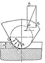 Сили різання при шліфуванні відносно невеликі, але потужність велика за рахунок великої швидкості. Схема роботи абразивного зерна показана на рис. 3