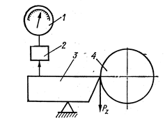 1. Метод зрівноважування заключається в тому, що вимірювальну силу зрівноважують протилежно напрямленою силою. Схема такого вимірювання подана на рис.4.Тут 1-зрівноважувальний пристрій; 2-масштабний пристрій; 3-різець; 4-заготовка. Сила PZ , що виникає при точінні, повертає різець, що впирається в масштабний пристрій 2 ( для збільшення масштабу показів і точності вимірювання) і в зрівноважу вальний пристрій 1. На точність вимірювання впливає тільки сила тертя в шарнірах.