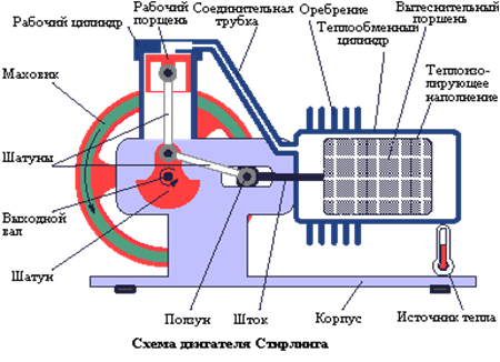 Двигатель состоит из рабочего и теплообменного цилиндров соединенных трубкой. В цилиндрах перемещаются соответсвенно рабочий и вытеснительный поршни, связанные шатунами, ползуном и штоком. Шатуны одеты на палец кривошипа, который находится на одном валу с маховиком. Источник тепла нагревает газ в правой части теплообменного цилиндра. Газ разширяется ичерез трубку оказывает давлением на рабочий поршень. Поршень опускается, толкает шатун и поворачиает маховик. При этом одновременно в право двигатеся вытеснительный поршень. Он вытесняет газ из нагревающейся части теплообменного цилиндра в его холодную часть, которая имеет охлаждающееся оребрение. Теплообменный поршень заполнен теплоизолирующим материалом. Газ остывает, создавая обратное усилие на рабочий поршень, поршень поднимается вверх и цикл повторяется с начала. Есть вариант двигателя в цилиндре которого устанавливались один над другим два поршня: вытеснитель и рабочий поршень. Вытеснитель делит полость над рабочим поршнем на две части "горячую" - расположенную между вытеснителем и торцом цилиндра и "холодную" - заключенную между поршнями. Обе части полости сообщаются между собой через перепускную магистраль, в которой последовательно установлены холодильник, примыкающий к "холодной" полости, регенератор и нагреватель, примыкающий к "горячей" полости. Задача вытеснителя состоит в перемещении рабочего тела из "горячей" полости в "холодную" и, наоборот, через перепускную магистраль. Поршни в цилиндре движутся попеременно, и их мертвые точки смещены. Двигатель Стирлинга впервые содержал теплообменник для регенерации тепла отработавшего горячего воздуха - регенератор . Существовавшие в то время материалы очень ограничивали уровень рабочих температур и давлений, что для двигателя Стирлинга было очень важно. Роберт Стирлинг выразил надежду, что препятствия, которые возникают из-за отсутствия соответствующих материалов со временем будут устранены. Он оказаля прав. В 20 веке о двигателе вспомнили снова. В настоящее время этот двигатель считается перспективным.