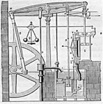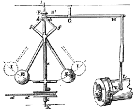 http://www.history.rochester.edu/steam/marshall/В 1781 г. шотландский инженер Дж.Уатт (Watt, James, 1736-1819) создал двигатель с вращающимся моментом на валу, на котором впервые был применен регулятор частоты вращения. Регулирование частоты вращения осуществлялось двумя сбалансированными на одной оси грузами, вращающимися синхронно с валом машины и соединенными с дроссельной заслонкой, перекрывающей проходное сечение парового патрубка. При увеличении частоты вращения центробежные силы вращающихся шаров поднимали с помощью тяг муфту, соединенную с заслонкой, уменьшая проходное сечение паропровода и скорость вращения двигателя.
