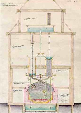Чертеж паровой машины И.И.Ползунова, выполненный изобретателем в 1765 году Машина была построена на Барнаульском заводе и действовала в 1766 году