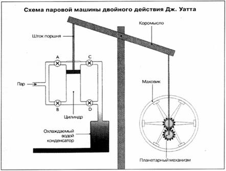 В 1782 году Уатт создал новую замечательную машину - первую универсальную паровую машину двойного действия. Крышку цилиндра он оснастил изобретенным незадолго до того сальником, который обеспечивал свободное движение штока поршня, но предотвращал утечку пара из цилиндра. Пар поступал в цилиндр попеременно то с одной стороны поршня, то с другой. Поэтому поршень совершал и рабочий и обратный ход с помощью пара, чего не было в прежних машинах.