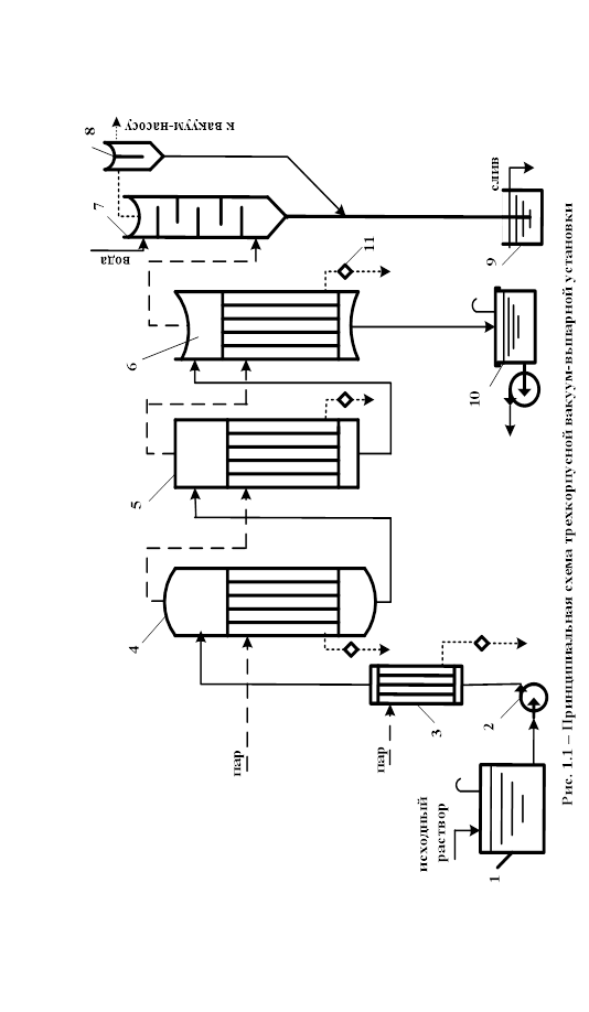Принципиальная технологическая схема трехкорпусной вакуум-выпарной установки непрерывного действия представлена на рис.1.1.