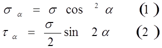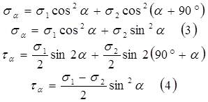 Розгляне плоский напружений стан двостороннього розтягу. Визначимо σα τα використавши принцип незалежності дії сил і ф-ли: