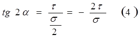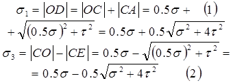 Із побудови Мора можна визначити не тільки величину головних напруг, але й їх напрямки. Напрям головної напруги σ1 збігається з з напрямком променя ЕА, що складає кут α з віссю σ. Визначимо кут α: