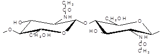Специфика полимерного состояния хитина, как и других высокомолекулярных соединений, обусловливает невозможность существования этого полимера как однофазной системы (полная кристалличность). Однако содержание кристаллических областей в хитине достаточно велико и составляет в зависимости от происхождения и способа выделения 60-85%. При этом фиксация взаимного расположения макромолекул хитина обеспечивается системой внутри - и межмолекулярных водородных связей: ОН-группа у С3 элементарного звена включена в водородную связь с атомом кислорода в цикле соседнего элементарного звена; ОН-группа у С6 может быть связана водородными связями как внутримолекулярно - с атомом кислорода гликозидной связи и (или) атомом азота ацетамидной группы, так и межмолекулярно - с ОН-группой у С6 соседней макромолекулы. При этом последняя может образовывать водородные связи с молекулами кристаллизационной воды.
