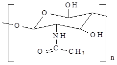 Хитозан является b-(1-4) - 2-амино-2дезокси-D-гликополисахаридом, т.е. аминополисахаридом, полученным при удалении ацетильной группы из положения С2 в хитине в результате обработки его в жестких условиях раствором щелочи, что позволяет заместить ацетильные группы хитина аминогруппами:
