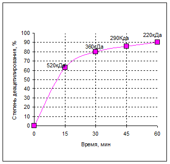 Процесс ДА проводят обычно с помощью концентрированных щелочей при повышенных температурах. Первым опытом получения хитозана, было сплавление хитина с твердой щелочью при 1800С. Этим способом получали продукт со степенью деацетилирования (СД) 95%, но значительно деструктированный (до 20 единиц).