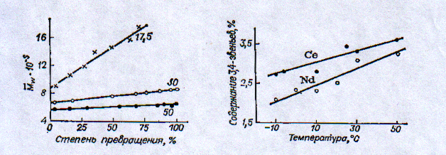 Полимеры, образующиеся на этих катализаторах, содержат до 98 % звеньев 1,4-цис-, и практически все молекулы мономера присоединяются по типу «голова к хвосту». Содержание 3,4-звеньев зависит от природы лантаноида и симбатно изменяется с температурой полимеризации (рис.4). Однако лантаноидные катализаторы пока не применяются при промышленном получении изопреновых каучуков, хотя привлекают к себе внимание научных центров многих стран мира.