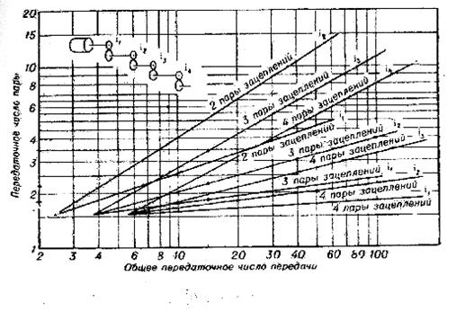 . Пользуясь номограммой (рисунок 2) для определения передаточного числа каждой пары, находим