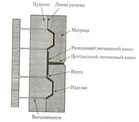 В каждой из систем расплав полимера подается в форму через центральный канал, называемый центральным литниковым каналом (рис.2). От центрального литникового канала отходят разводящие каналы, через которые расплав подается в оформляющие гнезда. Эти каналы сужаются вблизи оформляющих гнезд формы. В месте, где расплав входит в оформляющие гнезда, имеется специальный канал, называемый «впуск». Существуют два типа литниковых систем — горячеканальные и холодноканальные. Горячеканальные системы (обычно применяемые в производстве упаковки) постоянно заполнены расплавом, а в холодноканальных расплав в литниковых каналах затвердевает и удаляется вместе с отформованным изделием. В этом случае отливка извлекается из многогнездовой формы с помощью выталкивателя, отдельные изделия оказываются соединены между собой материалом из литниковых каналов. Эти излишки должны быть либо обломаны, либо отрезаны. Во избежание накопления отходов излишки материала, как правило, отправляются обратно в загрузочный бункер. Холодноканальные системы менее производительны, чем горячеканальные, однако последние более дорогие.