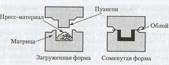 Рис.5 При прессовании пресс-материал с небольшим запасом помещается в разогретую форму. Когда пресс-форма смыкается под большим давлением, излишек выдавливается в виде облоя и должен быть впоследствии удален.
