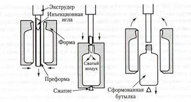 Из трех методов раздувного формования, применяемых для изготовления упаковки, наиболее широко используется метод, называемый «экструзионное формование с раздувом». Он заключается в экструзии трубки, называемой «преформа», в нижнем направлении. Когда она достигает нужной длины, разведенные половинки пресс-формы, окружающие заготовку, смыкаются, обрезая и замыкая дно, и остается только канал вверху для подвода сжатого воздуха, с помощью которого в дальнейшем и формуется изделие (рис. 7).