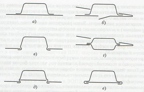 Рис. 12. Методы присоединения прозрачного блистера к декорированной подложке включают: а) нанесение буртика из термоклея; б) сгибание подложки с просечкой отверстия для блистера; в) размещение продукта (продукт размещается внутри блистера, который, складываясь, фиксируется на подложке); г) формирование двойного блистера на согнутой подложке (продукт выглядит плавающим в пространстве); д) двойную внутреннюю выточку (выемки в подложке служат частью уплотнения); е) формирование блистера с загнутыми краями, служащими в качестве направляющих для обеспечении скольжения подложки (способствующего более простому открытию упаковки и ее многократному использованию)