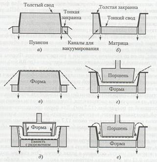 Рис. 13. Оснастка для термоформования: а) выпуклая форма; б) вогнутая форма; в) выпуклая форма для вакуумного формования; г) вогнутая форма со вспомогательным пуансоном; Э) возвратное формование (продавливает расплав полимера в вакуумную камеру, а затем вытягивает ее обратно); е) формование с предварительным раздувом листа (сжатый воздух раздувает лист пластика вверх, а пуансон вдавливает пластик вниз с одновременной откачкой воздуха из-под листа)
