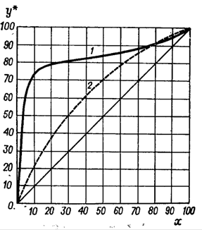 Рис.2. Кривые равновесия при П=760 мм рт. ст.: