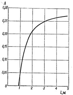 Рис.3. Зависимость поправки Δ от длины пути жидкости на тарелке l .