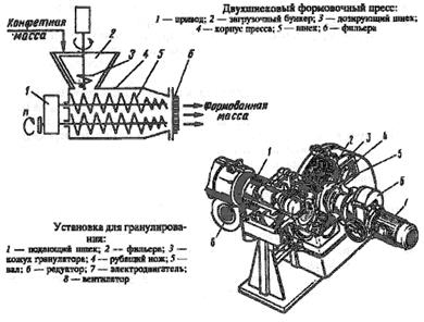 Двухшнековый формовочный пресс ( рис.4) используют в производстве конфет, в частности пралине, методом формования конфетной массы через фильеру с калиброванными отверстиями. Пресс создает давление в конфетной массе и продавливает ее через фильеру. Непосредственно на выходе из фильеры жгуты конфетной массы рубятся на гранулы эксцентрично установленными ножами гранулятора (рис.4), расположенными с определенным зазором у фильеры.