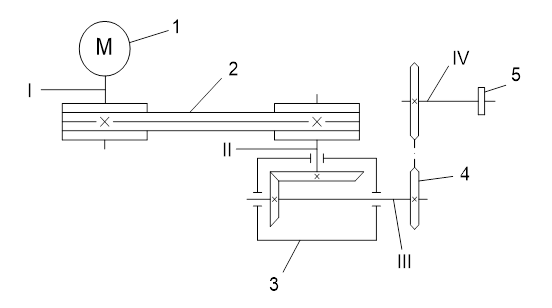 1 - электродвигатель, 2 - ременная передача, 3 - редуктор, 4 - открытая зубчатая передача, 5 - барабан