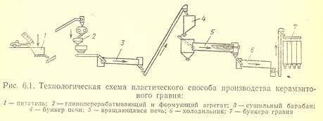 Наибольшее распространение получил пластический способ (рис. 1), при котором из рыхлого глинистого сырья после предварительной переработки до состояния пластичной массы формуются гранулы влажностью до 20 %, последние после подсушки или сразу направляют во вращающуюся печь. Для улучшения свойств керамзита в глиняную массу иногда вводят железистые и органические добавки. Гранулы направляют во вращающиеся печи, где сначала постепенно нагревают до 470-880 К, а затем быстро поднимают температуру до 1б50 К После обжига керамзит охлаждается, фракционируется и поступает на склад готовой продукции.