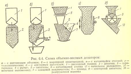 При весовом дозировании пористых заполнителей могут иметь место значительные колебания свойств бетонов за счет изменения объемной концентрации заполнителя. В производстве легких бетонов распространено объемно-весовое дозирование заполнителей. С помощью объемно-весовых дозаторов (рис. 2) рупный заполнитель дозируют по объему с точностью ± 3 % с одновременным фиксированием его массы. Мелкий заполнитель и цемент дозируют по массе с точностью + 2 %.