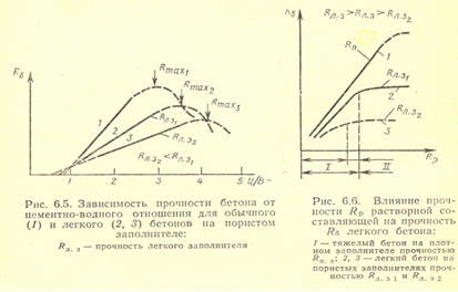 Прочность легких бетонов, как и обычных, зависит от активности цемента, водоцементного отношения, условий и длительности ,твердения, прочности заполнителей и некоторых других факторов.