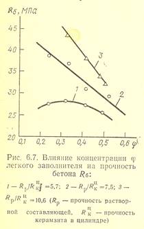 Существенное влияние на прочность легких бетонов оказывает содержание в нем крупного пористого заполнителя. Влияние концентрации заполнителя зависит от соотношения его прочности и прочности раствора. Обычно, при достаточно высокой прочности раствора в конструктивных легких бетонах увеличение концентрации заполнителя приводит к уменьшению прочности бетона. При малом различии в прочности раствора и бетона, например в конструктивно-теплоизоляционных легких бетонах, максимальная прочность достигается при определенной оптимальной концентрации заполнителя (рис. 5)