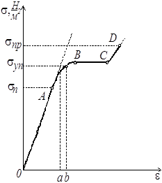 Предел текучести – это напряжение, которое характеризует такое состояние деформируемого тела, после которого удлинение возрастает без увеличения действующей силы (горизонтальный участок ВС).