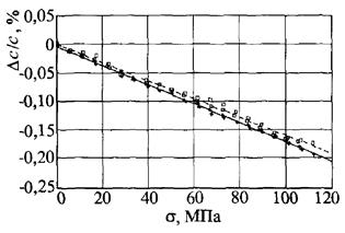 Рис. 2. Относительные изменении скорости под влиянием приложенных напряжений: о – измерения непрерывными волнами методом прохождения; • – импульсные измерения эхо-методом