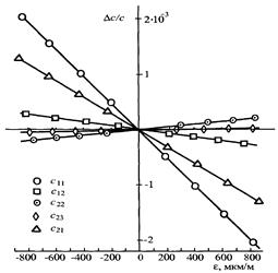 Рис. 4. Относительные изменения скорости дс/с в зависимости от деформаций для вариантов, показанных на рис. 3