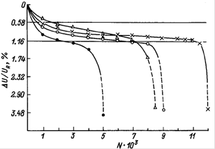 Скорость звука измеряли до и после приложения нагрузок. Часть образцов испытали до разрушения методом малоцикловой усталости. Скорость поверхностных волн измеряли периодически, по мере возрастания числа наработанных циклов N. Согласно (рис. 5) с ростом числа циклов, уровня циклических напряжений и температуры испытаний скорость волн в образце уменьшается.