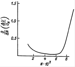 Представляется, что подобный вид зависимости Vt (n) может быть полезен для объяснения известного в теории надежности [11] U – образного характера зависимости интенсивности отказов (их числа в единицу времени) от времени эксплуатации t. Действительно, U – образной является показанная на рис. 7. зависимость dVt /dn от n (очевидно, n – t), построенная по данным рис 6: в терминах теории надежности, ее начальный этап соответствует приработочным отказам, стадия медленного спада СУЗ – периоду внезапных отказов (нормальная эксплуатация), а быстрый спад СУЗ сигнализирует о переходе к наиболее опасному периоду износовых отказов.