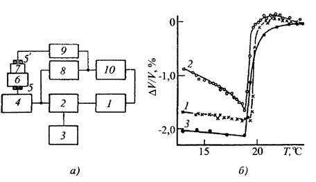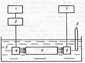 Рис. 8 Блок-схема ультра звуковой резонансной установки: 1 – частотомер Ч3–3З; 2 – генератор колебаний ГЗ (Г4 68); 3 – вода; 4 и б – излучающий и приемный пьезопреобразователи; 5 – цилиндрический образец; 7 – милливольт метр ВЗ-38; 8 – термометр