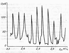 Для исключения влияния акустического контакта на результаты измерений образец вместе с преобразователями помещается в иммерсионную ванну, заполненную водой. Температура воды и соответственно образца измеряется термометром с точностью 0,1 К. Для акустических исследований резонансным методом наиболее удобны образцы в форме цилиндра диаметром 20–21 и длиной 80–90 мм с шероховатостью поверхности Rmax = 3,2 – 12,5 мкм. Их геометрические размеры можно контролировать с ошибкой 5 мкм микрометром и измерительным микроскопом. Для установления корреляций между резонансными ликами исследуемого образца после различных термообработок амплитудно-частотные зависимости необходимо снимать в диапазоне частот от 2,2 до 2,9 МГц, охватывающем не менее десяти резонансных ликов. Положение экстремальных точек этой зависимости определяется с ошибкой 0,1 кГц. На рис. 9. приведен участок амплитудно-частотной характеристики одного из образцов.