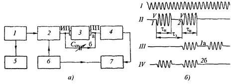 Рис. 12. Измерение скорости импульсно-фазовым способом (а) и электрические колебания, используемые при измерении скорости импульсно-фазовым способом: I – непрерывные гармонические колебания генератора высокой частоты; II импульсы, вырабатываемые модулятором; III – электрические сигналы, создаваемые акустическими импульсами; IУ – электрические сигналы, прошедшие через емкость связи во входную цепь приемника (6)