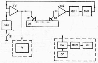 ГЗИ генератор запускающих импульсов; УсI импульсный усилитель; В1 и В2 – излучающий и приемный пьезопреобразователи; Об – образец (деталь); Ус2 - широкополосный усилитель; ФИI, ФИ2 – формирователь соответственно коротких и прямоугольных импульсов; Ч частотомер ЧЗ-З3; 51 – включатель; См – смеситель: ОГ генератор опорной частоты; ФНЧ – фильтр нижних частот; ИЧ – аналоговый измеритель частот.