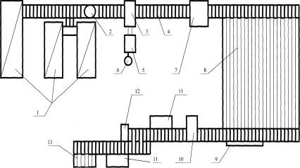 1-методические печи №1,2,3; 2-поворотный механизм; 3-прокатная клеть с подьемно-качающими столами; 4-рольганг; 5-шестеренная клеть; 6-электродвигатели; 7-правильная машина; 7-инспекторские столы №1,2; 9-разметочная машина; 10-гильотинные ножницы; 11-боковые ножницы; 12-клеймовочная машина; 13-листоукладчик.