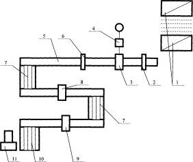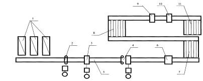 Рис.2.1. Схема расположения оборудования толстолистового стана «3500»: 1-нагревательные печи; 2- механический окалиноломатель; 3- прокатная клеть; 4- шестереная клеть; 5- рольганг; 6- ножницы поперечной резки; 7- шлепперы; 8-правильная машина; 9- дисковые ножницы; 10- карманы готовой продукции; 11- ножницы для порезки бракованных листов.